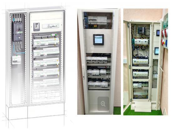 The figure shows a hub for the physical simulation of the power supply system (Figure 4), as well as a hub of the “smart shield” complex for the physical simulation of the power supply system’s control system (Figure 5).