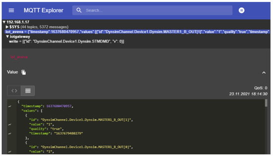Figure 9 shows the MQTT broker operation. The Iot_aveva topic was subscribed to the KEPServer agent, which collected values from the Aveva OPC server and forwarded them to the Mosquitto broker. The iotgateway topic was subscribed to the MQTT agent, which sent messages from the user through the MQTT augmented reality system to the broker. Additionally, the MQTT client KEPServer was subscribed to this topic, which sent values from the MQTT Broker back to the OPC server.