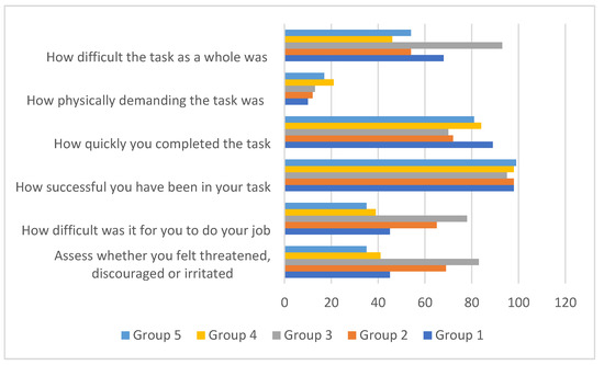 Additionally, to evaluate the developed solution, the augmented NASA Task Load Index (NASA-TLX) test was used to evaluate the cognitive-psychological factors when working with the application [36,37].