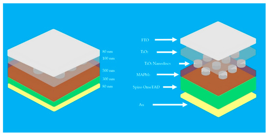 The PSC design in this study is simulated to obtain the best performance in terms of the lattice constant and radius of nanodisk variation. Typical structures of PSC include the FTO, ETL, perovskite, HTL, and metal electrode [36]. The simulated structure in this work is presented in Figure 1. The photogenerated charge carriers are generated in the absorber layer and go to the transport layers by the drift process. HTL and ETL block the electrons and holes, respectively, and then collect at the electrodes to create a potential difference. The best material for the absorber layer is methylammonium lead iodide, also known as MAPbI3, as mentioned in Jeyakumar et al. [5], with efficiency reaching 29%. TiO2 was commonly used as an ETL because of its proper electronic band levels and ease of fabrication [37]. The other common materials used in PSC was FTO, which is used as a transparent conductive layer, Spiro-OmeTAD was used as HTL, and gold (Au) was used as a metal electrode layer. The PC structure was introduced to the interface ETL/absorber to enhance the absorption of incident light and increase the interaction between carrier charges with a slow photon effect to reduce the recombination [38]. As with ETL, TiO2 was used as a PC material. The radius of the nanodisk PC is varied between 37.5 and 225 nm, and the lattice constant is varied between 450 and 1125 nm, while the thickness is fixed at 100 nm. This range is quite representative of finding the optimum size of the photonic crystal and providing a better search for the optimum photonic bandgap, based on the work of Wang et al. [29]. The PC was introduced at ETL/absorber because the energy band alignment at the interface is an essential factor for high-efficiency solar cells [5]. The flat-structured PSC is also simulated to study the enhancement of PSC performance.