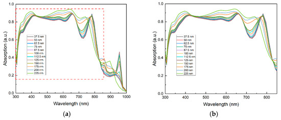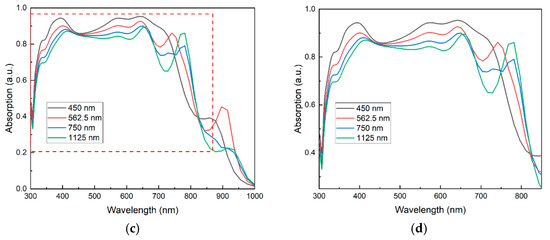 where E is the electric field, r is position, Pin is the incident light source power, is the angular frequency, and is the dielectric constant. The absorption spectra are obtained by integrating the positions corresponding to Equation (2).