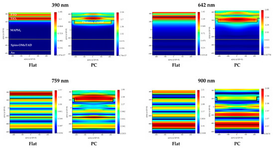 Electromagnetic field density profile of flat and PC-based PSC in 390 nm, 642 nm, 759 nm, and 900 nm.