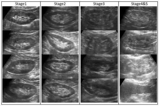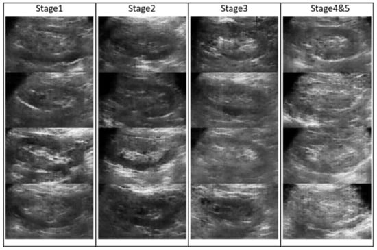 Kidney ultrasound image data collection. The images of different CKD stages are displayed from left to right columns.