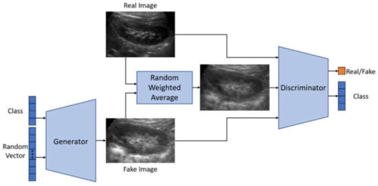 ACWGAN-GP is a variant of the GAN [19] proposed by Goodfellow et al. in 2014. It is a combination of ACGAN [27] and WGAN-GP [28], and explores the advantages of both approaches simultaneously. The structure is illustrated in Figure 2. It can generate images with labels and use the Wasserstein loss function and gradient penalty to train the GAN models. The potential distribution can be learned from a small set of CKD images and generates new images for training purposes. The critical loss function of ACWGAN-GP is represented by a combination of Equations (1)–(3) and shown in Equation (4), and the generator loss function of ACWGAN-GP is shown in Equation (5).