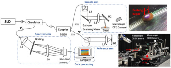 Schematic of Spectral Domain Optical Coherence Tomography (SLD: superluminescent diode, L1~L6: lenses, M1~M2: mirror, PC: polarization controller). Here, the microscope on the sample arm was used to adjust the seed orientation placed on a Petri dish. The photograph shows a picture of the real system, with the encircled region showing the seed. The bright region on the seed indicates the scan line. A cover glass plate was used to partially compensate for the dispersion introduced by the objective lens in the sample arm. Dispersion was also compensated based on offline correction of the data after collection.