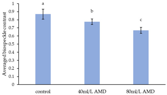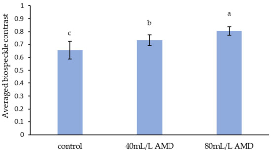 Figure 6 is obtained by calculating the averaged biospeckle contrast of six seeds under each treatment. The results showed that there were significant differences between the treatments. The contrasts of seeds under AMD treatments were significantly lower than that of the control, and the biospeckle contrast of seeds exposed to 80 mL/L AMD was significantly lower than that under 40 mL/L AMD (Figure 6).