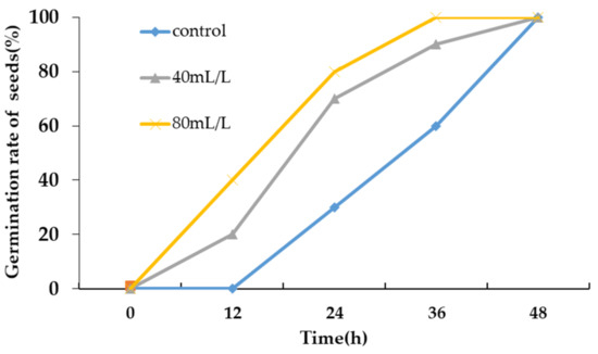 A total of 30 seeds were used per treatment. The number of germinated seeds in each treatment was counted every 12 h followed by normalization by the total number to obtain the germination percentage in each period.
