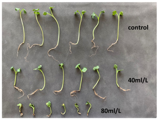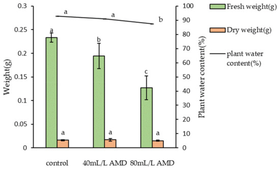 The differences in fresh weight between treatments were significant but not in dry weight (Figure 9). The difference between the fresh weight water content of the plants under the control and 80 mL/L AMD treatment was significant, and the difference with 40 mL/L AMD treatment was not significant. The results indicate that 80 mL/L AMD reduces the water content of Kaiware daikon.