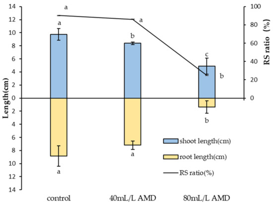 There were significant differences in shoot length between treatments (Figure 8). The difference in root length between the control and 80 mL/L AMD treatment was significant but not significant with 40 mL/L AMD treatment. There was a significant difference in the ratio of root to shoot between the control and 80 mL/L AMD treatment, but the difference with 40 mL/L AMD treatment was not significant. These results reveal that AMD inhibits shoot growth, and high concentration AMD inhibits root growth.