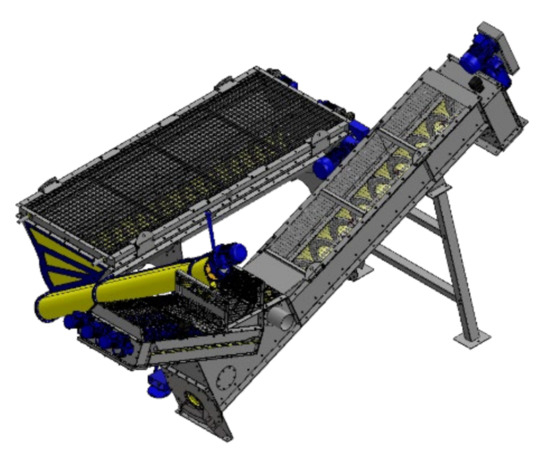 The innovation of the proposed system is also related to its efficiency in terms of energy consumption. In fact, compared to a traditional recycling plant consisting of crushing, washing, and screening operations that consume over 6 kWh of electricity per ton of treated material [31], the proposed solution allows for savings of over 10% in terms of energy consumption (5.5 kWh/t).
