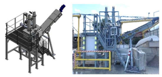 Figure 1. Treatment technology for inert fraction recovery. Mechanical system consisting of buffer and screws for the separation of fine aggregates (d < 5 mm) and coarse aggregates (d > 5 mm).