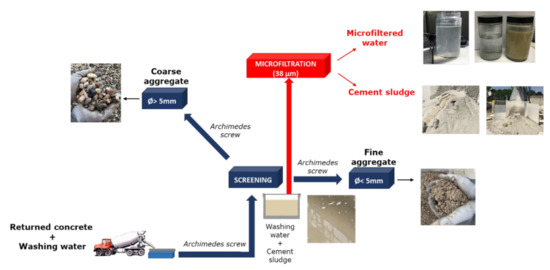 In a context of environmental protection and circular economy, the proposed technology allows the total recovery of the returned concrete without generating waste and, at the same time, safeguarding the virgin raw materials, such as natural aggregates and water. Figure 3 illustrates the entire proposed treatment process.