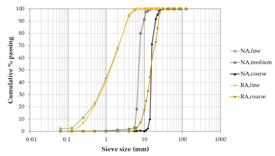 Particle size distribution of natural aggregates (NA) and recycled aggregates (RA).