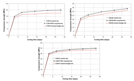 - Compared to the control concrete, the 50% recycled mixture reached similar compressive strength values at 28 curing days. Conversely, the cement sludge mixture generally showed a decrease in compressive strength of about 15% for C10/15 concrete grade and 7% for C25/30 and C30/37 concrete grade.