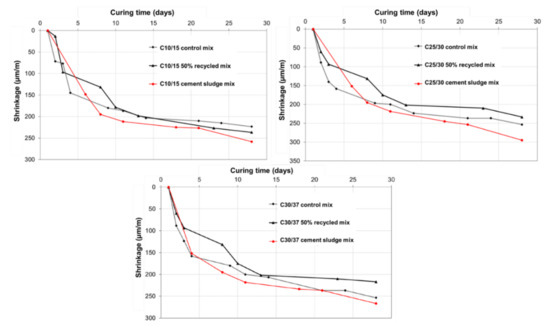 The hygrometric shrinkage tests were carried out according to UNI EN 11307. Figure 7 shows the trend over time of the sample’s deformation induced by the hygrometric shrinkage. In particular, the reported values refer to the average of the two measurements relating to the opposite faces of each sample. For concrete C10/15, the shrinkage deformation after 28 curing days ranged between 220 μm/m and 260 μm/m, while for C25/30 and C30/37 concrete grades, the values ranged between 230 μm/m and 300 μm/m and between 220 μm/m and 270 μm/m, respectively. Generally, when compared to a traditional concrete, the recycled aggregate and cement sludge mixtures have higher shrinkage.