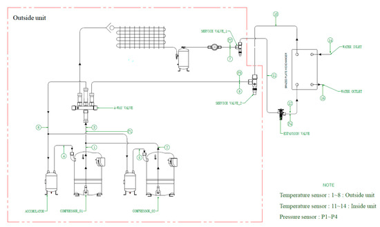 In the target building, a BAS (Building Automation System) for system control is established, enabling automatic control and monitoring of the heat pump system. Sensors such as temperature and pressure were installed in the indoor and outdoor units of the heat pump to collect the operational data required to develop the heat pump system performance prediction model. Figure 2 shows the diagram of the heat pump system and the location of the sensor installation. The operation data of the heat pump system was measured at 1 min intervals for each item, and data such as inlet/outlet temperature on the heat source side, inlet/outlet temperature on the load side, heat pump power consumption, outdoor temperature, and indoor temperature were collected.