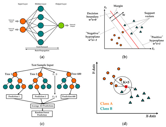 Figure 3. Diagram of machine-learning model. (a) ANN, (b) SVM, (c) RF, (d) KNN.
