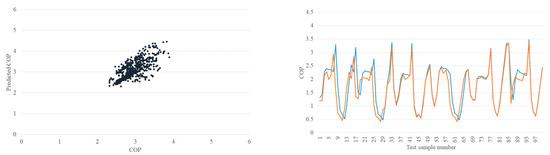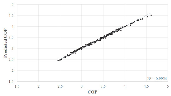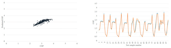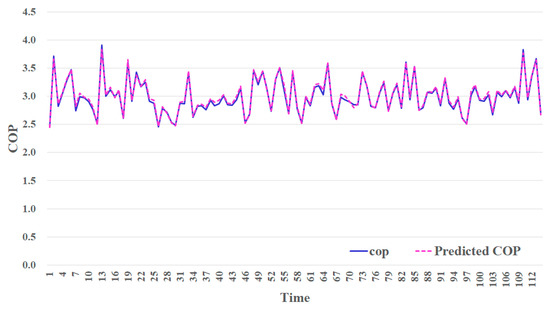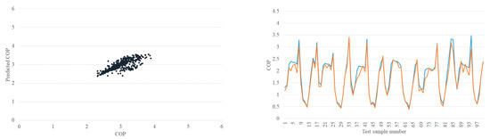 Figure 11 shows the predicted performance monitored by the BAS during the cooling operation period, and the prediction result R2 is 0.9954. Performance changes in the range of about 2.49 to 3.9 were observed during operation of the heat pump system, indicating even predictive performance in all ranges.