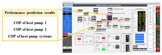 According to the results of the calculation speed and accuracy of the performance prediction model analyzed above, the ANN model showed the highest accuracy and the fastest calculation speed for the data format related to the performance prediction of the heat pump system. To verify the applicability of the developed ANN-based performance prediction model, the performance prediction model was applied to the BAS of the laboratory where the air-cooled heat pump system was installed. The BAS screen is configured to apply the performance prediction model of the heat pump system and monitor the results, and Figure 9 shows the BAS application screen. In BAS, the performance of the two heat pumps and the performance of the heat pump system are confirmed.