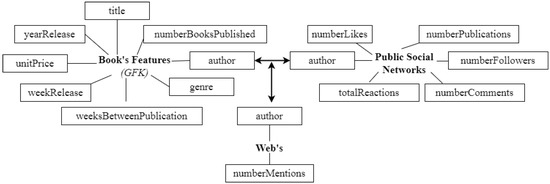 The data used is provided by (from now on, we will call it) “The Editorial”, respecting the anonymity of the medium; and correspond to the data of GFK [19] on the sale of books. It contains book titles, authors, release dates, price, and other features. The data is limited to the territory of Spain during the 2018–2020 period and to the literary genres Non-Fiction and Children/Youth. As a sample, 1169 books have been used, which, according to the experts of the publishing industry, are considered more sensitive to the popularity of the author. The analysis is based on the characteristics of a book, the author’s public social networks, and web mentions, which are shown in Figure 1.