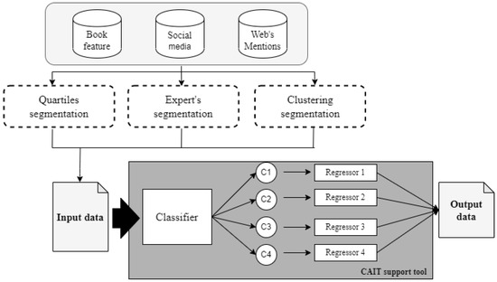 Once we have the input data, it contains the characteristics of the book, the data from social networks, the number of mentions on the Web, and the segmentation according to the book market. Then, they are entered into the support tool to verify the accuracy of the predictions. In this subsection, we will present the composition of the CAIT and the considerations that were considered for the selection of the optimal algorithm in the two parts of this combined model, according to the processed data. The use of classifiers (Part A) is due to the previously performed segmentation, based on the objective variable (number of copies or, what is the same, book sales). This analysis will be detailed in Section 4 and the use of regressors (Part B) because, thanks to its linear adjustment, it can bring us closer to the dependency relationship between the independent and dependent variables. Next, we will describe each of its components and, finally, the proposed predictive support system.