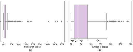 Results of quartiles segmentation. The boxplot represents the mean (center lines), standard deviation (box), range (dotted lines), and outliers (crosses) of the number of copies of books. (a) The quartiles can hardly be appreciated given the number of existing outliers. They are eliminated above 1.5 of the interquartile range, and the quartiles in (b) are appreciated where it is observed that in Q1 there will be less than 1808, in Q2 between 1808 and 4229, in Q3 between 4229, and 12,781 and Q4 greater than 12,781 number of copies.