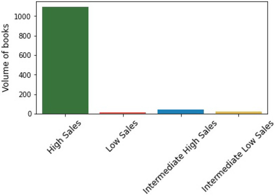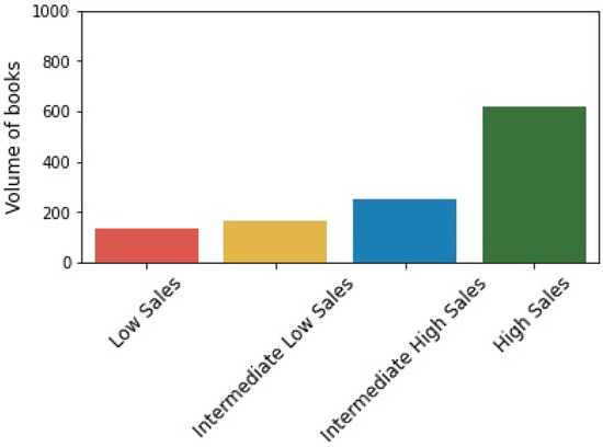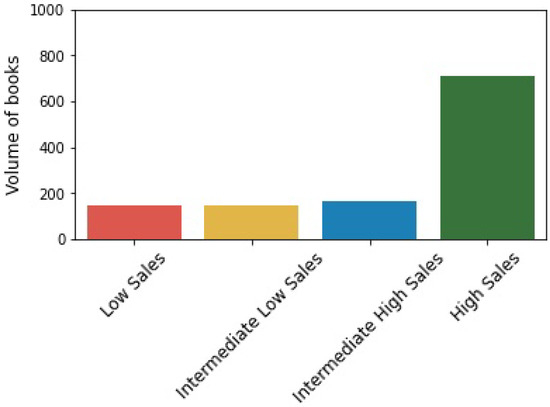 The first segmentation to test is the quartiles. Quartiles have been selected influenced by the segmentation of the experts after the analysis of the project requirement. For the dataset used, the numbers of book copies are grouped by author. If we observe Figure 3a, we can detect the existence of outliers, and they are eliminated above 1.5 of the interquartile range. Finally, we are left with Figure 3b, in which we can easily identify the 4 quartiles into which the number of copies can be segmented, being: less than 1808 (Q1—low sales); between 1808 and 4229 (Q2—low intermediate sales); between 4229 and 12 781 (Q3—high intermediate sales); and finally greater than 12781 (Q4—high sales) copies. This last quartile is the so-called Bestseller books. We will refer to the quartiles as classes so that it is easier later to compare them with the rest of the segmentations to be analyzed. A better understanding of the distribution of volume of data by the different segmentations of the quartiles can be seen in Figure 4.