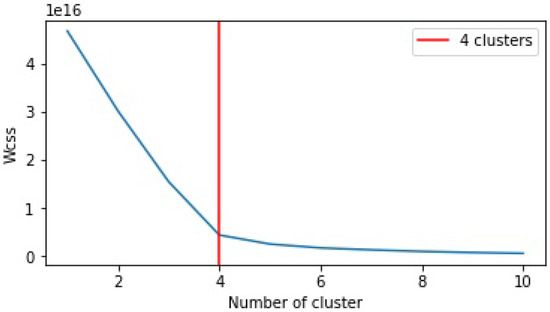 Before applying unsupervised learnings techniques for pattern matching, it is necessary to establish the optimal number of k groups. For this, we use the Elbow curve, which consists of plotting the sum of squared distance between each point and the centroid in a cluster (Wcss). As the number of clusters increases, the Wcss value will decrease. The rule applied to choose , as we can see in Figure 6. These results confirm that the number of segments suggested by the experts from the start is correct but that they can be obtained regardless of their knowledge.