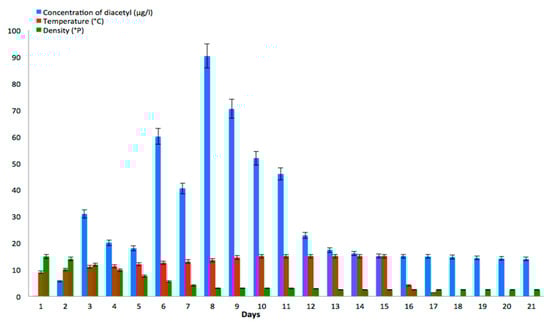 The total concentration of diacetyl in the beer must during and after fermentation results from a combination of the rate of formation of α-acetolactate, its rate of conversion, and the rate of reduction of diacetyl to 2,3-butanediol and acetone. Any latency of removed diacetyl concentration resulting from late fermentation production cannot be reduced until the beer undergoes further processing, which may require prolonged maturation or other processing or corrective measures to bring the final diacetyl concentration within the desired product target specification (0–40) micrograms per liter. This increase due to bacterial contamination reactions and the presence of oxygen which oxidizes ketones and alcohols is confirmed by Figure 5 which indicates that the oxygen level decreases as a function of time in the beer in parallel with other parameters such as temperature.