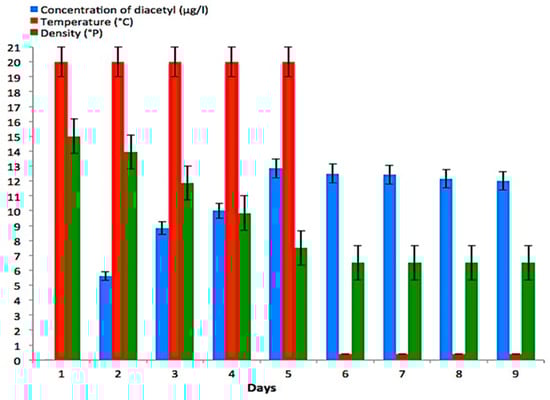 The final beer product under different conditions was analyzed by GC to identify its aroma compounds. The results show that the concentration of diacetyl also increases between the stop of fermentation and the release of the final product, with the concentration of diacetyl at the last day of fermentation is equal to 12 µg/L this concentration increases up to 160 µg/L in the final product. This difference requires control of factors such as oxygen level and temperature between the fermentation stage and the release of the final product (Table 6, Figure 3).