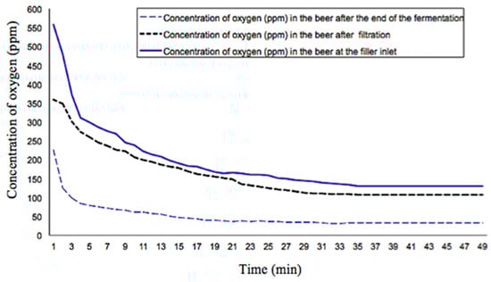 After filtration process, the oxygen concentration is higher than measured in the holding tank (after the end of fermentation). This concentration decreases over time. This occurs due to removing the air bubbles formed at the beginning of the filtration process. The water used in the preparation of the filtration layers contains a significant amount of oxygen.
