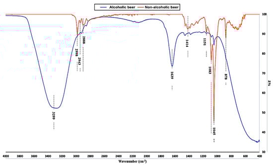 FTIR (Fourier transform infrared spectroscopy) spectra of alcoholic and non-alcoholic beer.