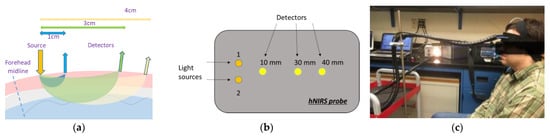 hNIRS measurement setup: (a) approximate interrogated volumes in the scalp, skull, and brain; (b) optical sensor layout; and (c) subject position.