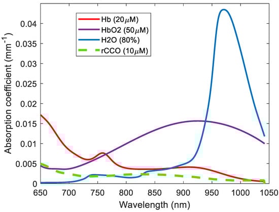 Absorption spectra of HHb, HbO2, H2O, and rCCO.