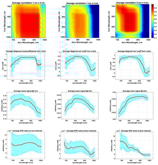 Hyperspectral signal analysis: cross-subject averaged correlation, temporal means, and temporal standard deviations for signals from 1 cm, 3 cm, and 4 cm channels. Blue color shows the cross-subject standard deviations.
