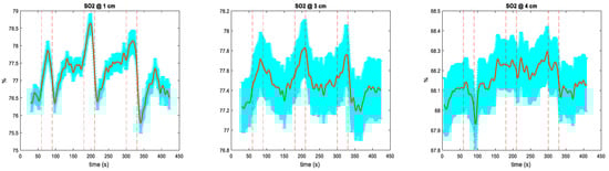 Cross-subject averaged changes in [HbO2], [HHb], and [rCCO], and regional SO2 measured at 1 cm, 3 cm, and 4 cm using the homogeneous tissue model and 750–900nm waveband. Blue color shows the cross-subject standard deviations.
