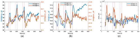 In addition, we also used Equation (10) to calculate the specific cerebral response in the total hemoglobin . However, was calculated not by using the spectral unmixing, but by directly using Equation (10) around 800 nm since at this wavelength . Since near 800 nm is greater than , could include a crosstalk with