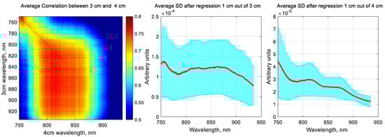 Cross-subject average correlation and standard deviation spectra of signals from the 3 cm and 4 cm channels after regressing out changes measured at the 1 cm channel.