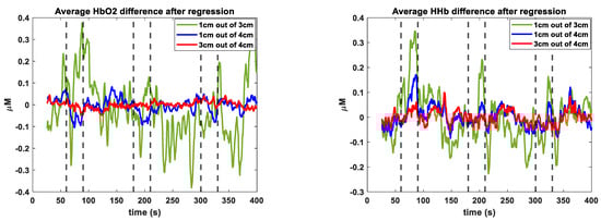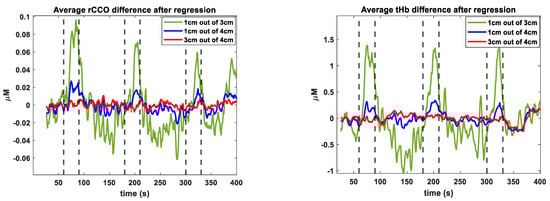where is the change in the cerebral absorption coefficient, and are the scalp partial pathlength at 3 cm and 4 cm, respectively, and and are the cerebral partial pathlength at 3 cm and 4 cm, respectively. Since the pathlengths in Equations (4)–(6) were specific for every individual and unknown, could not be algebraically excluded to find . However, since Equations (4) and (5) were linear with respect to the common time-dependent and , for every wavelength, one could exclude the time-course common with from and . Indeed, one could rewrite Equations (5) and (6) in the form