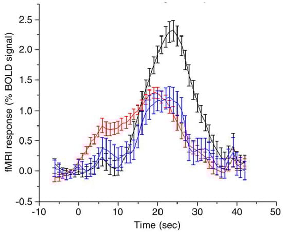 (Adapted from [23]) Averaged BOLD signal time-course with breath holding of 15 s after expiration on areas supplied by the MCA (red), ACA (blue), and PCA (black).