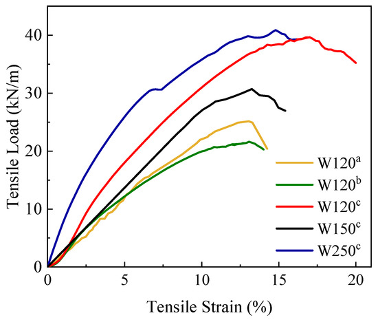 - ASTM D4595-17. Standard Test Method for Tensile Properties of Geotextiles by the Wide-Width Strip Method; American Society for Testing and Materials: West Conshohocken, PA, USA, 2017. [Google Scholar]