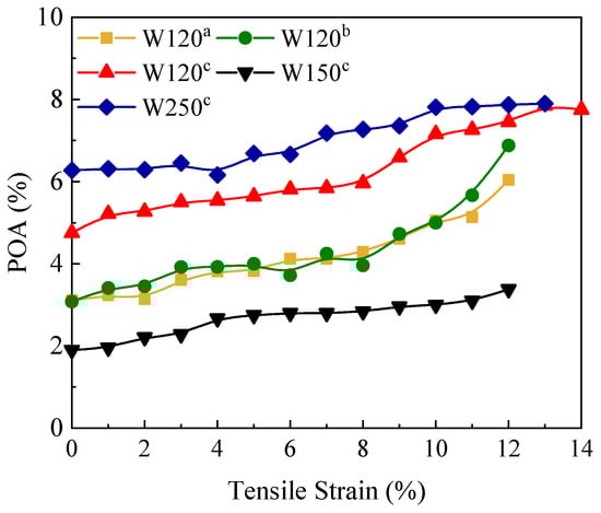 POA is the ratio of open area to the total area of a woven slit-film geotextile. The open area and area of filaments correspond to the number of white and black pixels, respectively, in a binary image. Figure 4 shows that the POA of unstrained specimens varies in a wide range from 1.98% (geotextile code W150c) to 6.10% (code W250c). As uniaxial tensile strain increases, the POA is monitored and recorded at each 1% tensile strain.