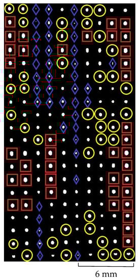 Figure 7 demonstrates a random distribution of various pore sizes within the illuminated region of unstrained geotextile W120c. The specific large pore sizes ranging from O80s to O100s are marked with red squares. The yellow circles and blue diamonds mark the specific medium pore sizes ranging from O40s to O60s and the specific small pore sizes ranging from O0s to O20s. For the selected region of geotextile W120c, the large pore sizes are identified to be mainly located on the outer sides, the small pore sizes are located inside the district and the medium pore sizes are located randomly in the selected region.