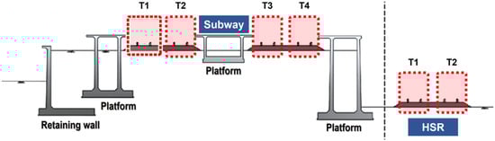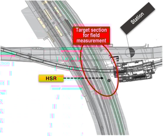 The field measurement in this study was conducted on the site where the excavation work had been planned adjacent to the structure of the serviced subway line and the high-speed railway line. In the field measurements, the target section was measured with a track-geometry-measurement system (Track master) and a railbed-settlement-monitoring sensor (RM sensor), and the evaluation of the Wheel-Rail dynamic responses was performed based on the measured data. The schematic of the target section for field measurement is shown in Figure 4.