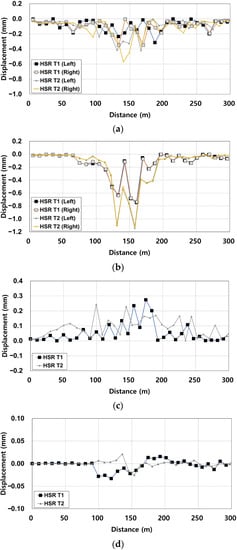 As shown in Figure 3b, in the case of the alignment (based on 10 m), the maximum alignment of the HSR T1 track ranged from 0.74–0.75 mm, and the maximum alignment of the HSR T2 track ranged from 1.12–1.14 mm.