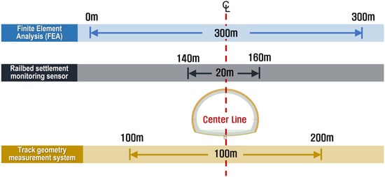 A previous study by Chung et al. [1] investigated an evaluation method of the track deformation in the ballasted tracks on serviced railway lines with respect to adjacent excavation and assessed the impact of the irregularities in the track of the serviced railway line with respect to the excavation adjacent to the railway infrastructure. Choi [2] performed a qualitative analysis on the dynamic behavior of the ballasted tracks and presented a dynamic model for the analysis of the Wheel-Rail-interaction-force analysis. The analysis demonstrated that the Wheel-Rail interaction force can be significantly changed due to track irregularities, and the results of experiments and a numerical analysis showed that the train speed was the main parameter. Hwang analyzed the effects of track irregularities on the dynamic wheel load of concrete tracks by applying the track irregularities measured in the section with track support stiffness changes in which a considerable vertical profile displacement occurred in the concrete tracks [3]. Choi et al. conducted a study to analyze ground subsidence according to the tunnel passage in a geologically vulnerable zone [4]. The analysis investigated the ground subsidence and deformation in the existing urban railway infrastructure due to the weakened ground conditions from the adjacent tunnel excavation. The results showed that deformation in the vertical direction was dominant in the case of the railway infrastructure in the geologically vulnerable section. Lee, Choi et al., and Cho investigated the improvement method of an automated measurement and evaluation system, deformation of serviced railway line track, deformation of tunnel structure, and deformation of subway structure according to the adjacent excavation [5,6,7]. Knothe analyzed the definition of track irregularities and the effects of track irregularities on rolling stock-track interactions [8]. Wang et al. proposed a disturbance rejection through a controller-optimization method for disturbances induced by track irregularities that are caused by track deformation and installation errors on a maglev line [9]. Urda et al. quantified the irregularities of the railroad track using an automatic recording vehicle and confirmed that the values measured by the automatic recording vehicle and the values measured by the manual-measuring method agreed closely [10]. Ramos et al. compared the short- and long-term behaviors based on laboratory experiments and numerical analysis in order to verify the performance of ballasted and concrete tracks subjected to periodic loads [11]. As a result, the numerical-analysis and the experimental outcomes were consistent. Munoz et al. developed a Kalman-filtering-based methodology to monitor the lateral track irregularities [12]. The Kalman-filter-based strategy showed high accuracy and robustness when a systematic parametric analysis was performed based on a highly simplified linear bogie model and was able to capture the most relevant dynamic behavior.