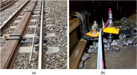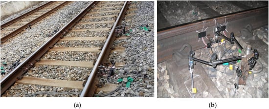 As shown in Figure 8, the target track for field measurements was a double ballasted track on the high-speed railway line, the track shape was a straight line with a welded rail section of 60 kg/m. For dynamic-wheel-load measurements, a total of four measurement points were set at 2 m intervals. For the installation of the wheel-load sensor, a wheel-load gauge wired in eight directions was attached at an angle of 45° from the neutral axis of the inner and outer rail web, respectively, at a distance of 100 mm from the center, between railroad ties [2].