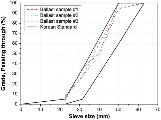 The key track component that directly affected the track-support performance and the dynamic behavior of the ballasted track was the ballast. In the spring structure arranged in series that composed the ballasted track, the ballast with the softest spring stiffness had a dominant effect on the dynamic responses of the ballasted track. Therefore, to obtain dynamic responses in a ballasted track without irregularities, it is important to evaluate the state of the ballast. In the particle-size test of the ballast, which is generally used to evaluate its degradation state, the state of the ballast was determined to be acceptable if the particle size of the sample was included within the standard particle-size distribution curve. In this study, the ballast particle-size test was performed by collecting three sets of ballast samples from the target section. As a result of the particle-size test, all of the ballast samples collected from the track field-measurement section were found to satisfy the standard particle-size distribution curve, as shown in Figure 9, thus indicating that the ballast state in the target section was acceptable.