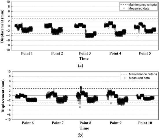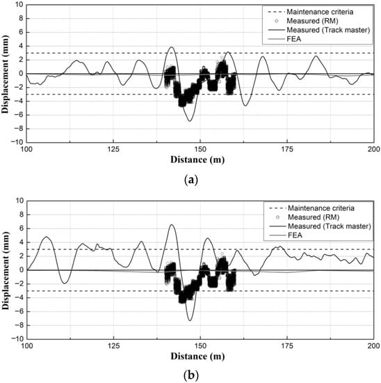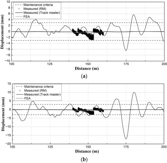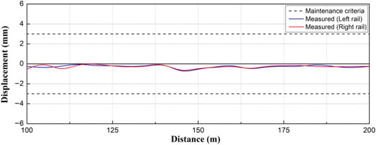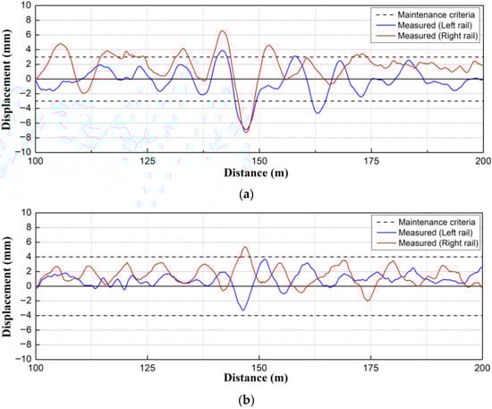 As shown in Figure 11a, the measurements of the track irregularities of the HSR T1 track in the target section yielded maximum vertical profiles for the left and right rails of ~6.93 mm and ~7.41 mm, respectively. These exceeded the maintenance criteria by values in the range of 4–4.5 mm. In addition, it was found that the vertical profile was larger in the right compared with the left rail, and the right rail of the HSR T1 track was more vulnerable to the vertical profile due to the adjacent excavations.