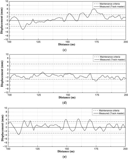 In this study, track irregularities were measured using a Track master. The targets of the track-irregularity measurements included the vertical profile, alignment, cross level, gauge, and twist. Relevant measurement results are presented in Figure 11.